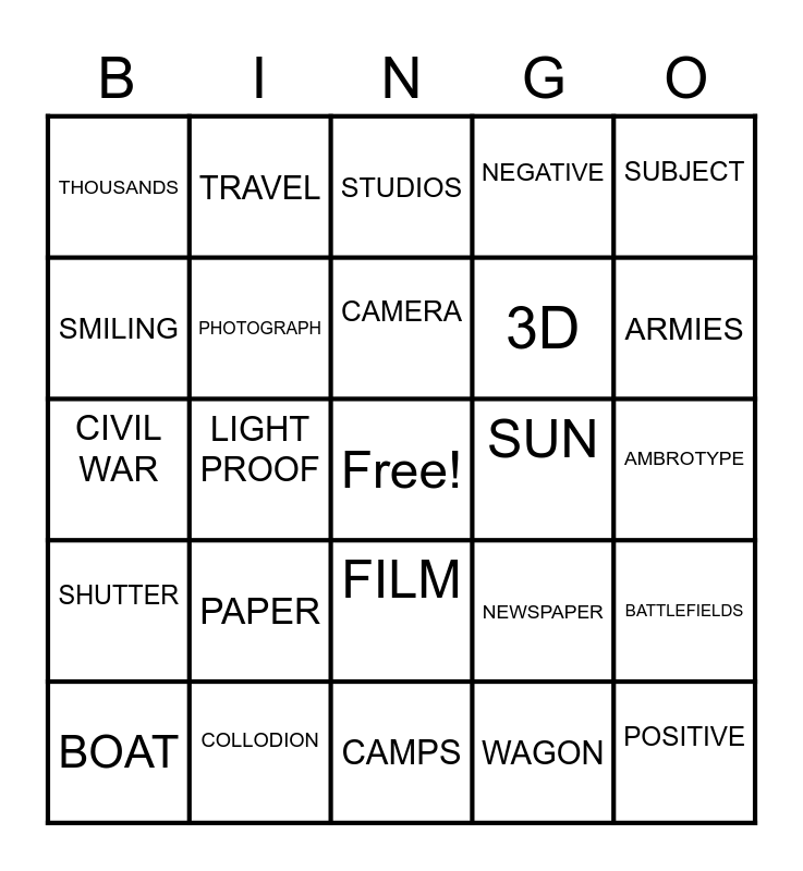 This bingo card has a free space and 41 words: FIRST, CIVIL WAR, STAGING, PHOTOGRAPH, COLLODION, FILM, CAMERA, LENS, SUBJECT, SHUTTER, LIGHT PROOF, NEGATIVE, POSITIVE, AMBROTYPE, SUN, PAPER, GLASS, THOUSANDS, CITIES, STUDIOS, BATTLEFIELDS, TOWNS, CAMPS, 3D, DOCUMENT, CHEMICALS, WAGON, WAR ZONE, ARMIES, HOSPITALS, 10,000, TRAVEL, BOAT, ENGRAVING, NEWSPAPER, SMILING, DIGITAL, FINGERPRINTS, CATALOGS, SMITHSONIAN and ARCHIVES.