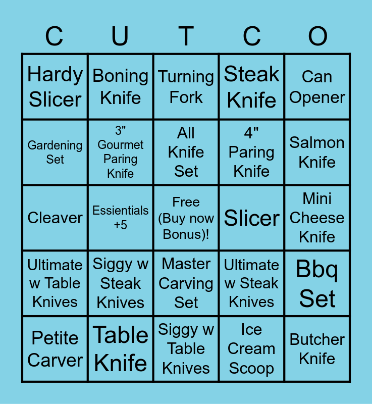 This bingo card has a free space and 44 words: Spatula Spreader, Butcher Knife, Paring Knife, Petite Carver, Trimmer, Ice Cream Scoop, Turning Fork, Pizza Cutter, Can Opener, Table Knife, Steak Knife, Slicer, Master Carving Set, Siggy w Steak Knives, Homie+8, Siggy w Table Knives, Cutco Kitchen, Cleaver, Petite Slicer, Salmon Knife, Boning Knife, 5"Santoku, 7"Santoku, Hardy Slicer, Cheese Knife, Mini Cheese Knife, Wine Opener, Super Shears, Ultimate w Steak Knives, Ultimate w Table Knives, Gift Sets, Bbq Set, K-bar, Fishermans Solution, Essientials +5, Studio +4, Gourmet Set, Kitchenette Set, All Knife Set, Gardening Set, 4" Paring Knife, Birds Beak Paring Knife, 3" Gourmet Paring Knife and Carving Fork.