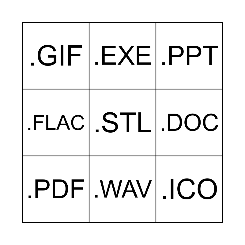 This bingo card has a free space and 8 words: .DOC, .PPT, .EXE, .PDF, .GIF, .ICO, .FLAC and .WAV.