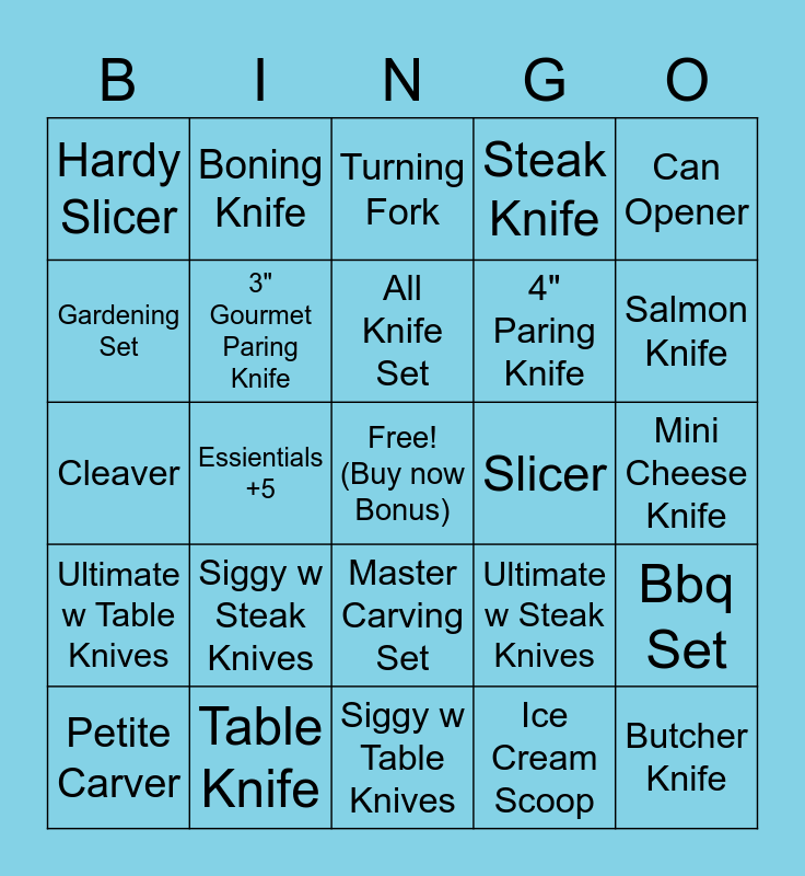 This bingo card has a free space and 44 words: Spatula Spreader, Butcher Knife, Paring Knife, Petite Carver, Trimmer, Ice Cream Scoop, Turning Fork, Pizza Cutter, Can Opener, Table Knife, Steak Knife, Slicer, Master Carving Set, Siggy w Steak Knives, Homie+8, Siggy w Table Knives, Cutco Kitchen, Cleaver, Petite Slicer, Salmon Knife, Boning Knife, 5"Santoku, 7"Santoku, Hardy Slicer, Cheese Knife, Mini Cheese Knife, Wine Opener, Super Shears, Ultimate w Steak Knives, Ultimate w Table Knives, Gift Sets, Bbq Set, K-bar, Fishermans Solution, Essientials +5, Studio +4, Gourmet Set, Kitchenette Set, All Knife Set, Gardening Set, 4" Paring Knife, Birds Beak Paring Knife, 3" Gourmet Paring Knife and Carving Fork.