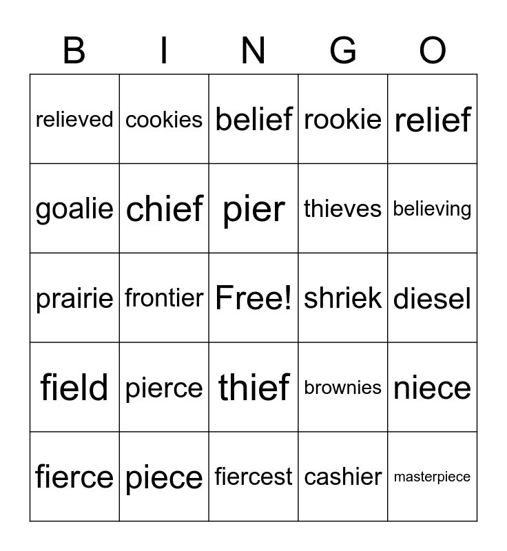 This bingo card has a free space and 24 words: pierce, piece, pier, fierce, relief, relieved, goalie, cookies, shriek, thief, thieves, prairie, brownies, niece, chief, cashier, diesel, belief, believing, frontier, masterpiece, field, rookie and fiercest.