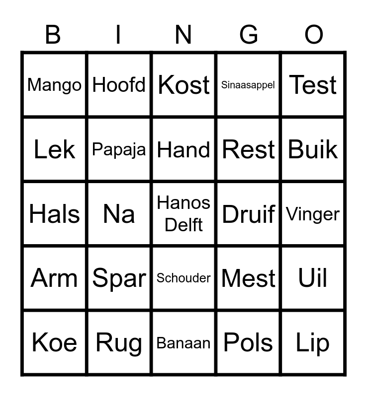 This bingo card has a free space and 97 words: Appel, Peer, Banaan, Sinaasappel, Mandarijn, Ananas, Passievrucht, Aardbei, Framboos, Blauwe bes, Braam, Kiwi, Kers, Druif, Lychee, Mango, Papaja, Komkommer, Tomaat, Sla, Dadel, Pitaya, Kruisbes, Klaver, Been, Arm, Voet, Hand, Mond, Bel, Hals, Hoofd, Neus, Oor, Lip, Haar, Elleboog, Knie, Enkel, Buik, Bavel, Rug, Schouder, Pols, Vinger, Teen, Geen, Wel, Niet, Pas, Lap, Tas, Gat, Trui, Broek, Polo, Sok, Kost, Les, Spel, Stoer, Stem, Klas, Klaar, Tak, Kat, Hond, Reus, Heks, Uil, Koe, Vogel, Duif, Vroeg, Laat, Glas, Was, Sap, Rest, Voor, Achter, Na, Lood, Sloot, Pad, Das, Spar, Ras, Gras, Hek, Lek, Klem, Stem, Mest, Test, Hooi and Kooi.