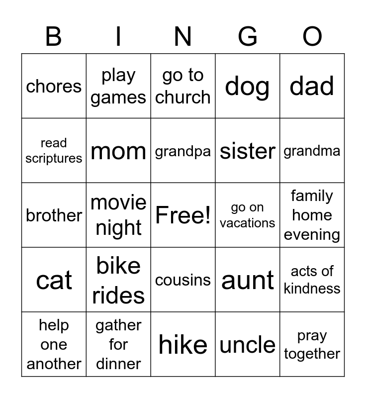 This bingo card has a free space and 24 words: bike rides, gather for dinner, grandpa, help one another, dad, chores, read scriptures, play games, go on vacations, cousins, sister, brother, aunt, acts of kindness, mom, uncle, family home evening, go to church, grandma, movie night, pray together, cat, dog and hike.