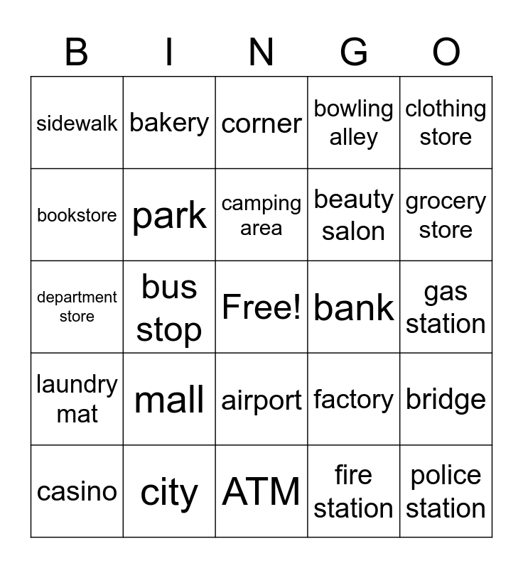 This bingo card has a free space and 30 words: city, neighborhood, bus stop, bike path, sidewalk, corner, park, airport, bank, ATM, gas station, police station, fire station, city hall, grocery store, parking lot, factory, laundry mat, mall, clothing store, department store, farm, bakery, beauty salon, bookstore, bowling alley, bridge, casino, camping area and cathedral.
