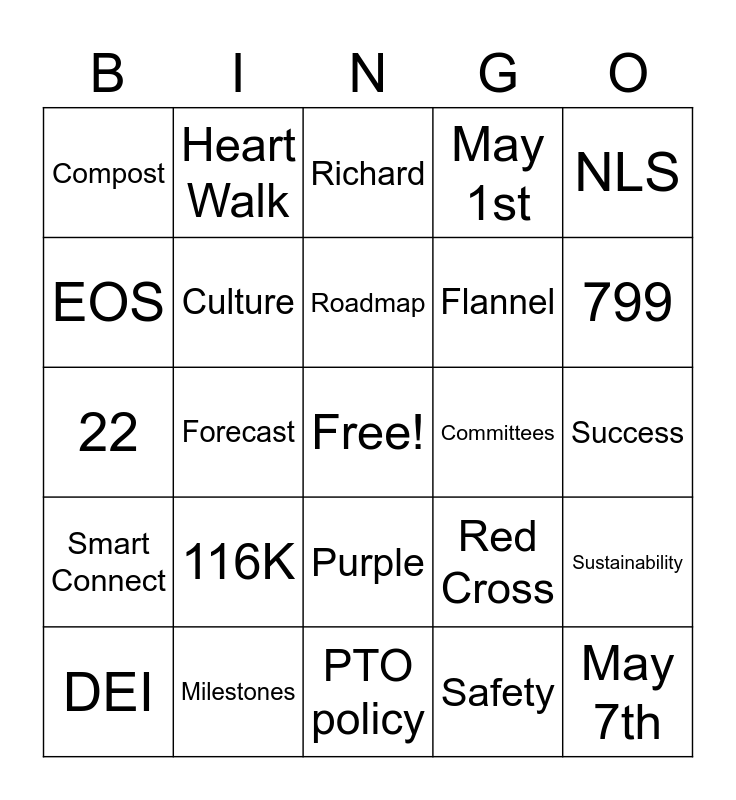 This bingo card has a free space and 24 words: 116K, Milestones, Roadmap, DEI, NLS, Compost, EOS, Heart Walk, Committees, Purple, Flannel, 22, Red Cross, Sustainability, Culture, Safety, Success, Richard, 799, Forecast, May 7th, Smart Connect, May 1st and PTO policy.