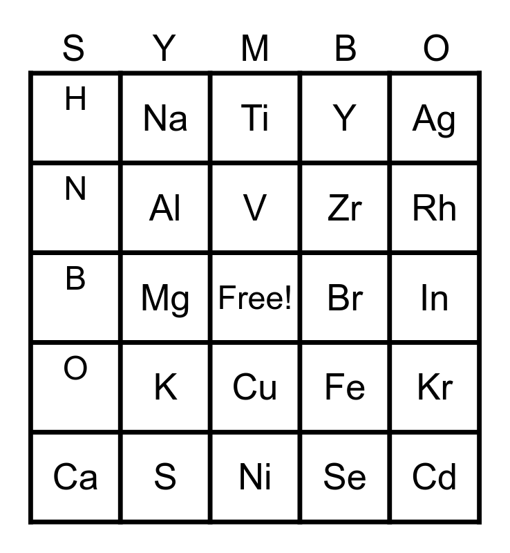 This bingo card has a free space and 24 words: Ca, K, V, Se, Ag, H, Na, Ti, Br, In, B, Al, Fe, Kr, N, S, Ni, Y, Rh, O, Mg, Cu, Zr and Cd.