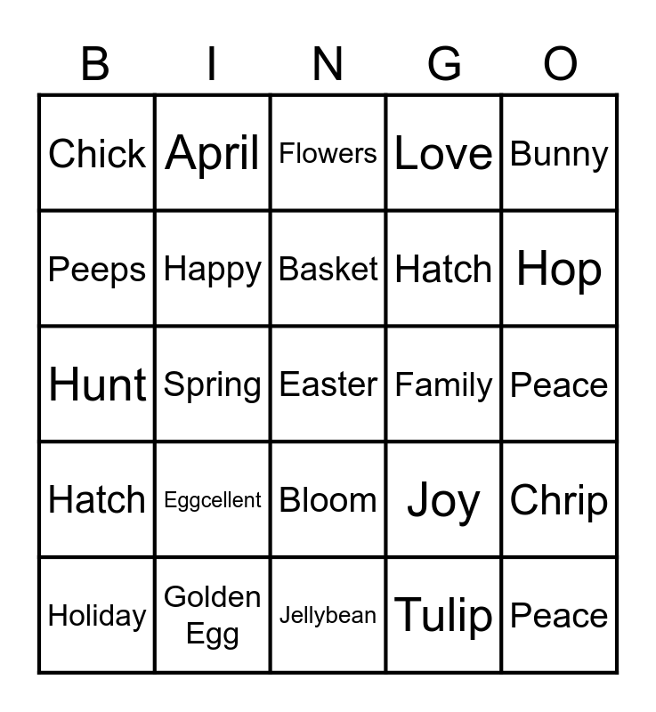 This bingo card has a free space and 24 words: Eggcellent, Golden Egg, Basket, Holiday, Bunny, Chick, Peeps, April, Family, Bloom, Hatch, Hunt, Joy, Chrip, Happy, Tulip, Peace, Flowers, Hop, Spring, Peace, Hatch, Love and Jellybean.