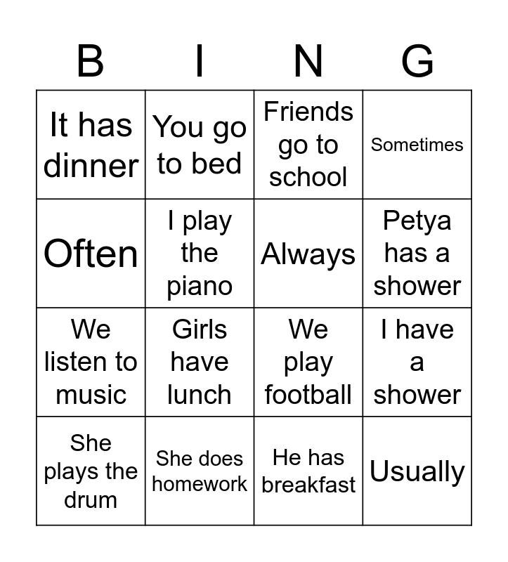 This bingo card has 16 words: She does homework, I have a shower, Friends go to school, It has dinner, We listen to music, You go to bed, We play football, He has breakfast, Often, I play the piano, She plays the drum, Sometimes, Girls have lunch, Petya has a shower, Always and Usually.