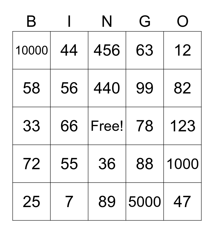 This bingo card has a free space and 24 words: 55, 7, 440, 25, 12, 10000, 58, 44, 78, 36, 99, 33, 88, 1000, 56, 5000, 123, 456, 82, 66, 47, 72, 63 and 89.