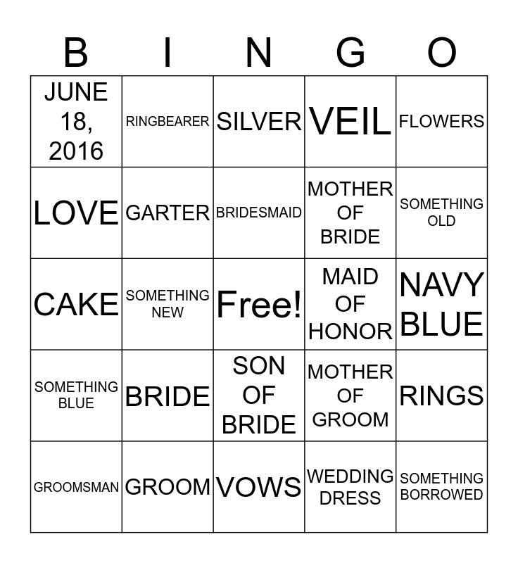 This bingo card has a free space and 24 words: BRIDE, GROOM, BRIDESMAID, GROOMSMAN, FLOWERS, JUNE 18, 2016, LOVE, RINGBEARER, MAID OF HONOR, SON OF BRIDE, MOTHER OF BRIDE, CAKE, MOTHER OF GROOM, RINGS, GARTER, WEDDING DRESS, NAVY BLUE, SILVER, SOMETHING OLD, SOMETHING NEW, SOMETHING BORROWED, SOMETHING BLUE, VEIL and VOWS.