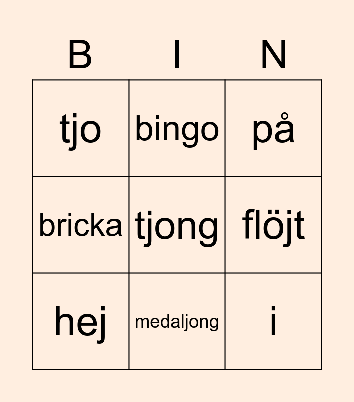 This bingo card has 9 words: hej, på, bingo, bricka, tjo, flöjt, tjong, i and medaljong.