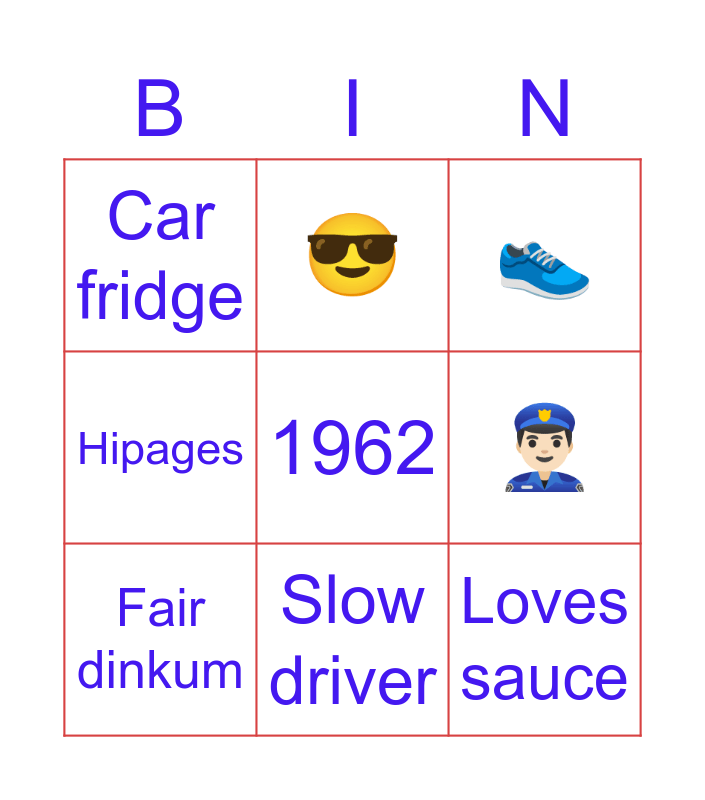 This bingo card has 12 words: Mighty Dees, Loves sauce, 1962, 👮🏻♂️, 😎, 👟, Slow driver, Big Tone, Car fridge, Hipages, Fair dinkum and Broken coccyx.