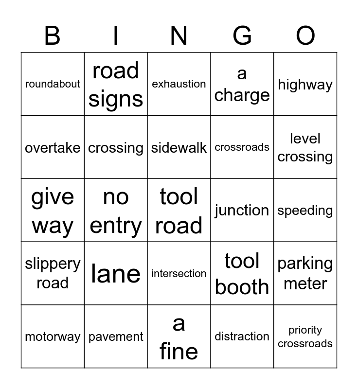 This bingo card has a free space and 24 words: lane, pavement, sidewalk, motorway, highway, roundabout, overtake, road signs, junction, intersection, crossroads, give way, tool booth, parking meter, crossing, distraction, speeding, exhaustion, level crossing, no entry, priority crossroads, slippery road, a charge and a fine.