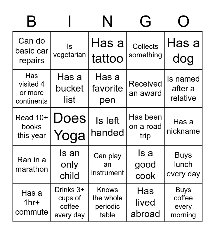 This bingo card has 36 words: Free!, Met a celebrity, Loves Wearing funny socks, Has a bucket list, Is a good cook, Ran in a marathon, Has a favorite pen, Bikes to work, Has a dog, Knows ASL, Does Yoga, Collects something, Listens to Podcasts, Has been on a road trip, Is named after a relative, Can do basic car repairs, Buys coffee every morning, Is an only child, Is left handed, Has a tattoo, Has a nickname, Buys lunch every day, Drinks 3+ cups of coffee every day, Has a 1hr+ commute, Knows the whole periodic table, Is vegetarian, Read 10+ books this year, Hates writing meeting minutes, Received an award, Has visited 4 or more continents, Speaks 2+ languages, Failed their first driving test, Has lived abroad, Can play an instrument, Taught a class and Prefers working from home.