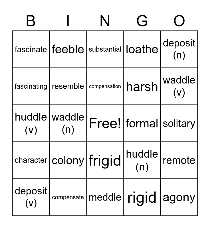This bingo card has a free space and 24 words: colony, compensate, compensation, deposit (v), deposit (n), fascinate, fascinating, feeble, formal, frigid, harsh, huddle (v), huddle (n), remote, resemble, rigid, solitary, substantial, waddle (v), waddle (n), agony, character, loathe and meddle.