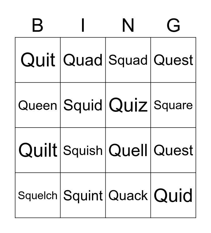 This bingo card has 16 words: Squint, Quest, Squad, Quit, Quilt, Quad, Quell, Quack, Queen, Squid, Squelch, Quest, Squish, Square, Quiz and Quid.
