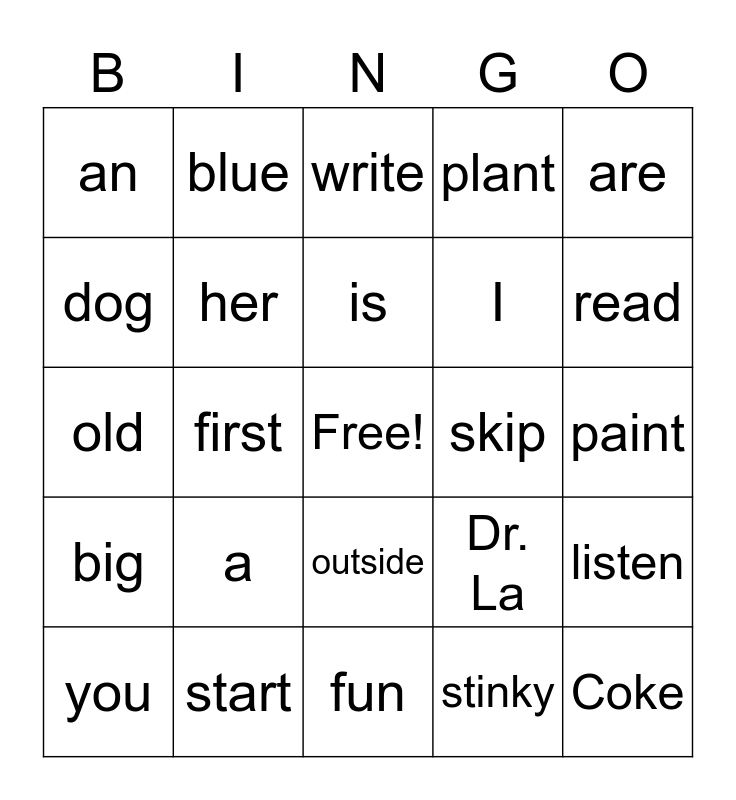 This bingo card has a free space and 49 words: me, Coke, run, fun, a, early, blue, silly, dog, the, her, plant, listen, Dr. La, Disney, his, is, skip, card, are, first, stinky, an, I, Pepper, read, you, slowly, outside, big, teeth, learn, cat, Miami, start, flower, April, soon, paint, a, give, cranky, tiny, stars, old, write, book, clap and Monday.