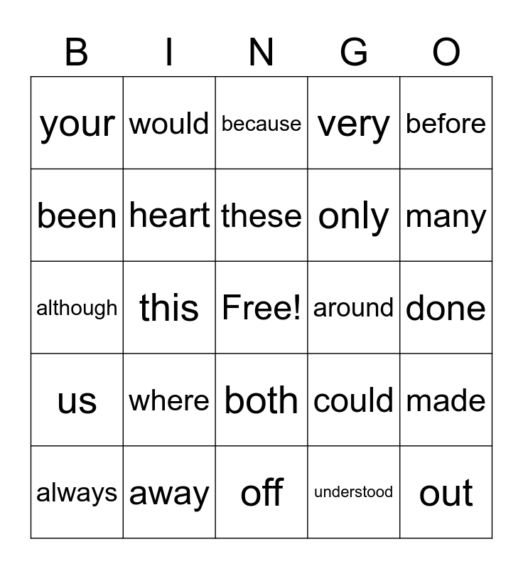 This bingo card has a free space and 24 words: where, away, these, always, before, your, been, would, around, both, only, although, could, made, heart, understood, done, because, many, this, out, us, very and off.