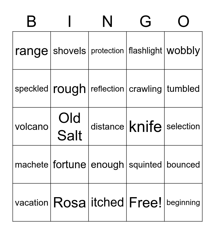 This bingo card has 30 words: Rosa, Tony, Old Salt, edge, range, protection, rough, enough, knife, itched, selection, distance, Free!, beginning, tumbled, landmarks, squinted, machete, fortune, wobbly, volcano, speck, shovels, crawling, speckled, flashlight, bounced, vacation, reflection and furnace.