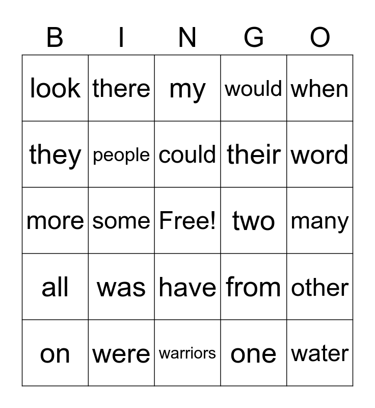 This bingo card has a free space and 24 words: was, were, could, on, when, look, they, there, two, have, their, more, from, other, people, one, many, my, word, some, water, all, would and warriors.