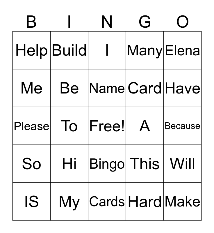 This bingo card has a free space and 24 words: Hi, My, Name, IS, Elena, Help, Me, Build, A, Bingo, Card, Please, This, Will, Be, Hard, Because, I, Have, To, Make, So, Many and Cards.