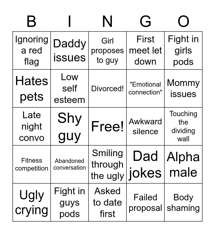 This bingo card has a free space and 44 words: Religious incompatibility, Body shaming, Love triangle, Ugly crying, Rejection, Failed proposal, Girl proposes to guy, Thrown drink, Fight in girls pods, Fight in guys pods, First meet let down, Awkward silence, Smiling through the ugly, Abandoned conversation, Goes home early, Asked to date first, Too much to drink, Late night convo, 2 day love story, Mommy issues, Daddy issues, Has a kid(s), Narcissist, Ignoring a red flag, Age gap, Touching the dividing wall, Laying on the floor, Forced laughter, Dad jokes, Fitness competition, Interracial love, Alpha male, Nerd, CREEP ALERT, Shy guy, Plus sized, Shein dress malfunction, Single under 25, Divorced!, Hates pets, "Emotional connection", Misleading "next time on" promo, Low self esteem and "Is love blind?".