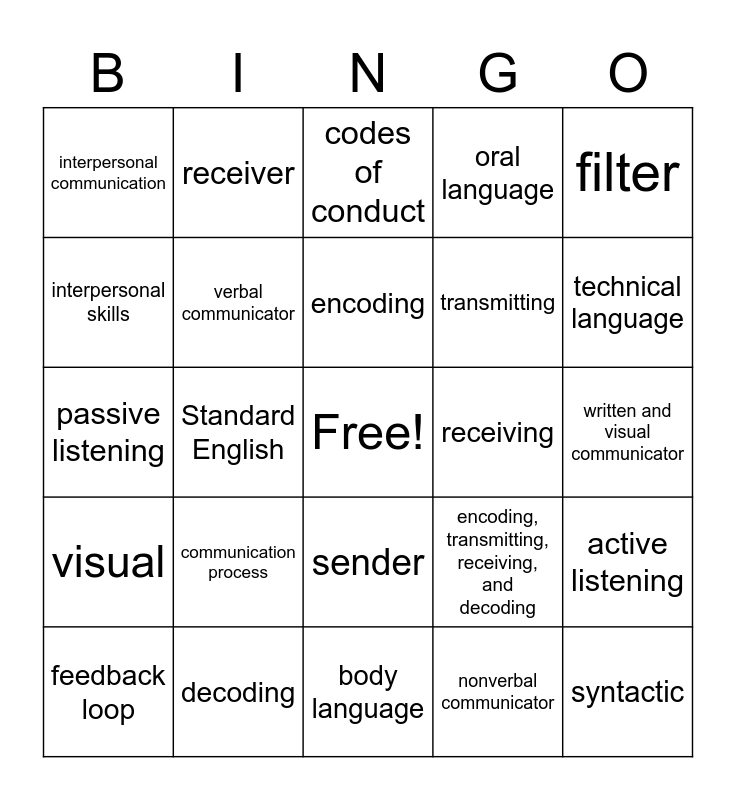 This bingo card has a free space and 24 words: communication process, decoding, encoding, feedback loop, filter, interpersonal communication, interpersonal skills, receiver, receiving, sender, transmitting, passive listening, encoding, transmitting, receiving, and decoding, active listening, verbal communicator, nonverbal communicator, written and visual communicator, codes of conduct, technical language, Standard English, syntactic, visual, oral language and body language.