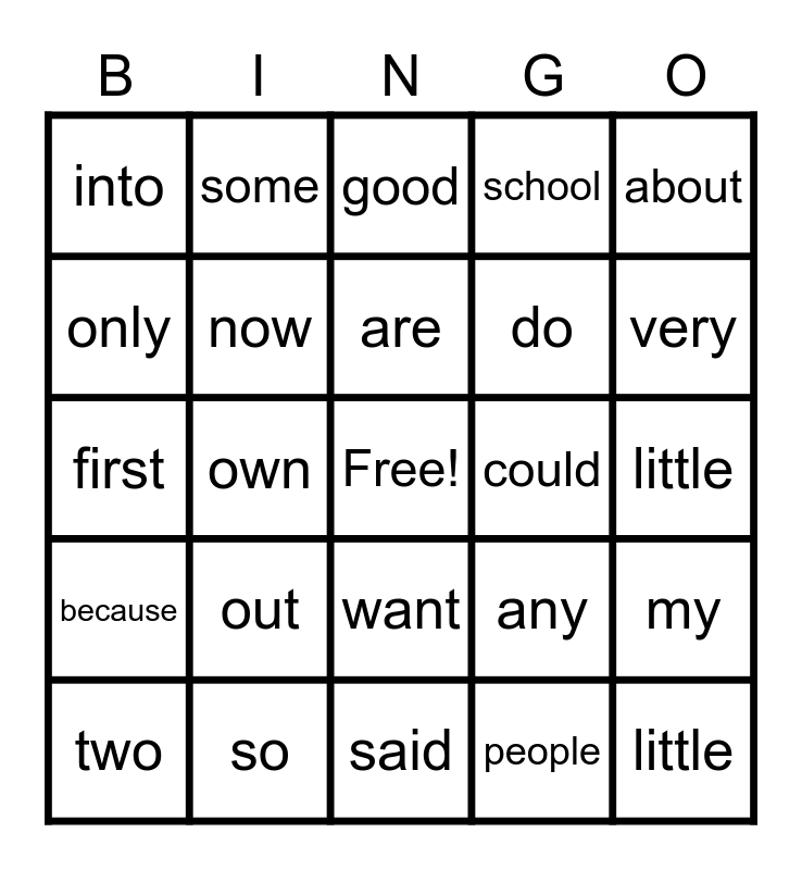 This bingo card has a free space and 24 words: out, so, are, two, about, into, only, some, could, want, do, first, any, my, now, people, little, good, very, own, little, because, school and said.
