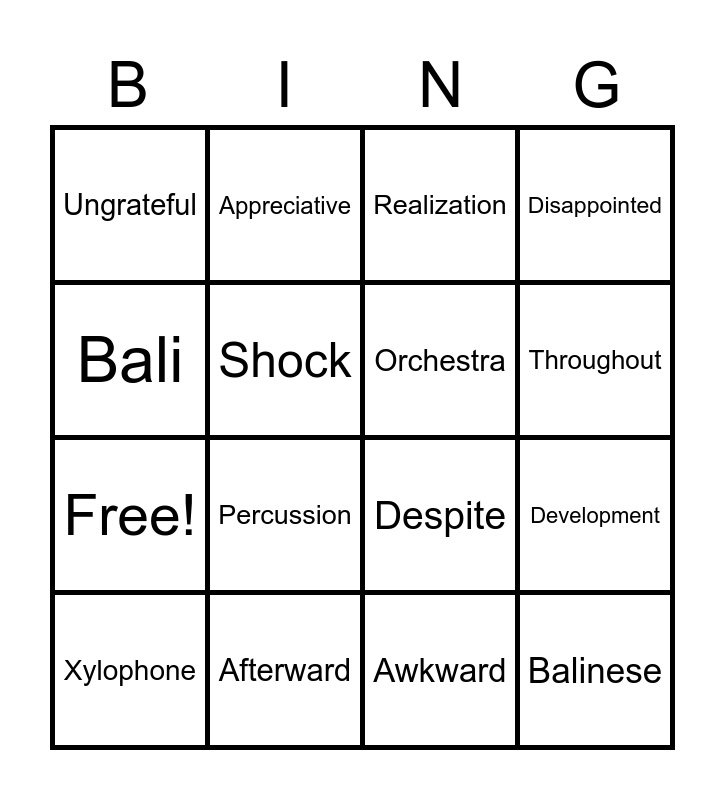 This bingo card has 22 words: Free!, Culture, Shock, Awkward, Disappointed, Ungrateful, Appreciative, Realization, Development, Xylophone, Percussion, Orchestra, Instrument, Opinion, Believe, Belief, Balinese, Bali, Afterward, Despite, Throughout and Willing.