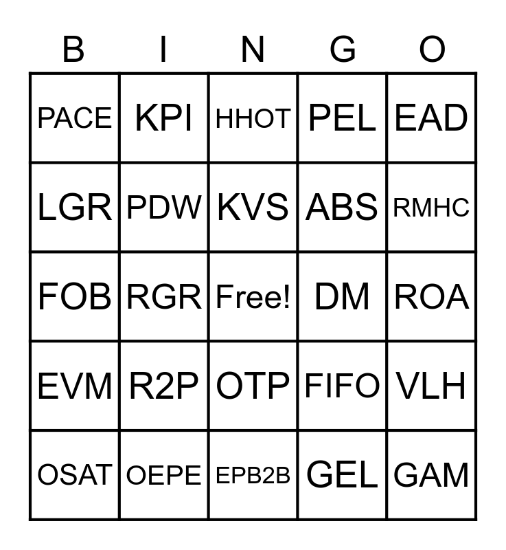 This bingo card has a free space and 24 words: R2P, OEPE, KVS, OSAT, EAD, PACE, LGR, KPI, DM, OTP, ABS, FOB, FIFO, VLH, PDW, GEL, ROA, HHOT, RMHC, RGR, GAM, EVM, PEL and EPB2B.