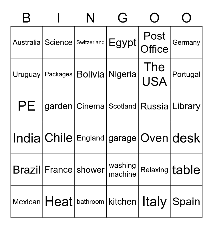 This bingo card has 68 words: Free!, PE, Drawer, Heat, Relaxing, Dish, Science, Naughty, Packages, Circus, Library, Usually, Cinema, Post Office, Argentina, Germany, Portugal, Australia, Greece, Russia, Bolivia, India, Scotland, Brazil, Ireland, Africa, Italy, Spain, Chile, Japanese, Switzerland, Chinese, Korea, Syria, Egypt, Mexican, The Netherlands, England, Nigeria, The USA, France, Paraguay, Uruguay, living room, bedroom, dining room, kitchen, bathroom, garden, garage, washing machine, sink, fridge, Oven, cupboard, sofa, desk, bookcase, armchair, table, lamp, chair, wardrobe, mirror, bed, toilet, shower and bath.