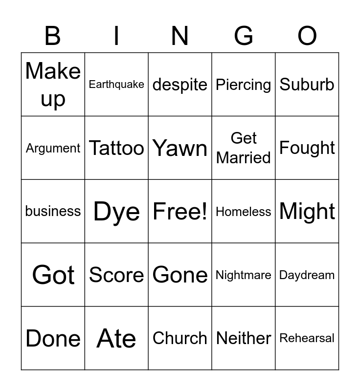 This bingo card has a free space and 49 words: Ring, Rehearsal, Tied, Church, Score, Crush, Earthquake, Commitment, Argument, Paragliding, Tattoo, Piercing, Daydream, Nightmare, Sleepwalk, Snore, Yawn, Homeless, Slum, Suburb, Dye, Neither, Make up, Get Married, Spoken, Fought, Done, Been, Gone, Got, Broken (V), Chosen (V), Forgotten, Understood, Ate, Dream, Sleepwalking, Ring, Might, Would, Will, weather, umbrella, unable, business, despite, illegal, environment and hibernate.