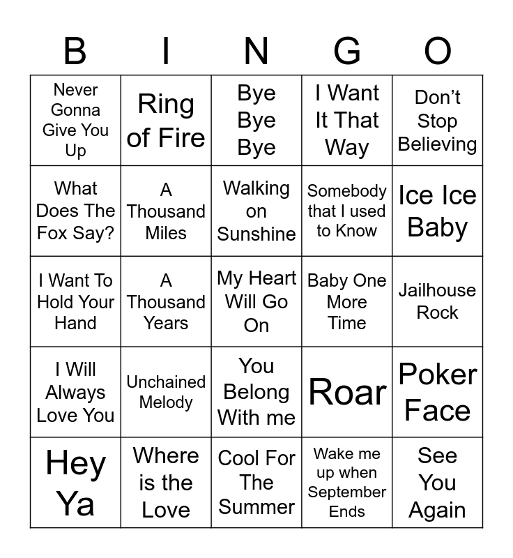 This bingo card has 59 words: Bohemian Rhaspody, Where is the Love, Thriller, I Will Always Love You, Wake me up when September Ends, Bring Me To Life, A Thousand Miles, Mr. Brightside, Somebody that I used to Know, Piano Man, I Want It That Way, Livin’ On A Prayer, What Does The Fox Say?, Gangnam Style, All Star, Never Gonna Give You Up, My Heart Will Go On, Don’t Stop Believing, Eye of the Tiger, Walking on Sunshine, Baby One More Time, Bye Bye Bye, Hey Ya, Poker Face, Imagine, I gotta Feeling, Whatever You Like, Hey Soul Sister, Ice Ice Baby, Total Eclipse of the Heart, Single Ladies, Baby, Billie Jean, Call Me Maybe, Ring of Fire, What Makes You Beautiful, Dynamite, A Thousand Years, Hey Jude, I Want To Hold Your Hand, Hound Dog, Unchained Melody, Jailhouse Rock, Hey There Delilah, What a Wonderful World, Blank Space, Jolene, Wrecking Ball, You Belong With me, Cool For The Summer, Party in the USA, Welcome To My Life, The Sound of Silence, Stairway to Heaven, Not Afraid, Roar, Payphone, See You Again and Hello.