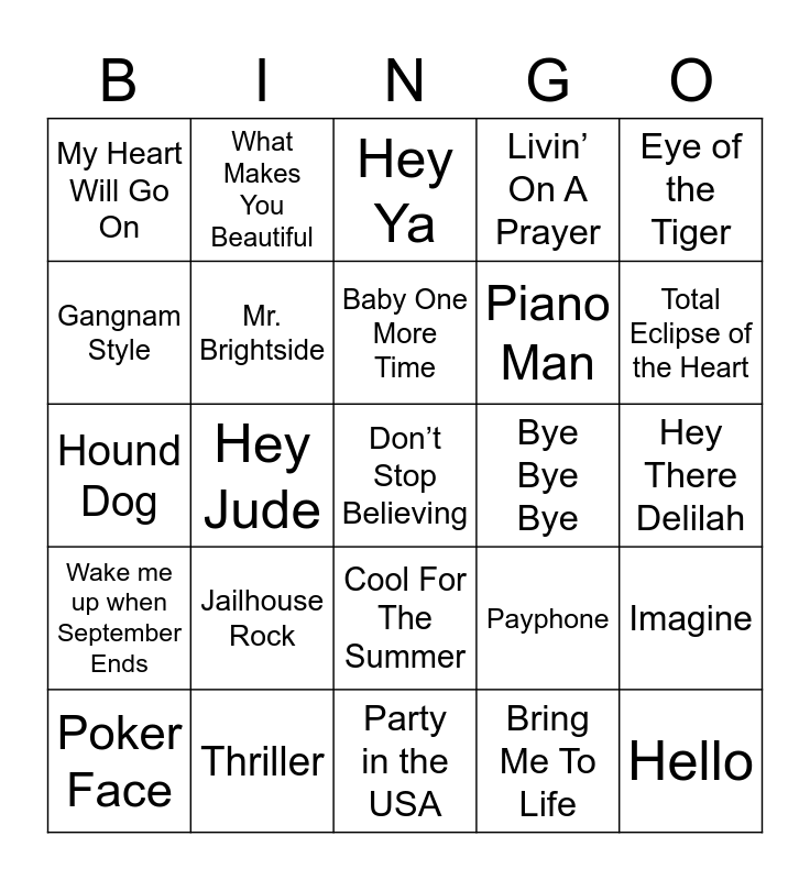 This bingo card has 59 words: Where is the Love, Thriller, I Will Always Love You, Wake me up when September Ends, Bring Me To Life, A Thousand Miles, Mr. Brightside, Somebody that I used to Know, Piano Man, I Want It That Way, Livin’ On A Prayer, What Does The Fox Say?, Gangnam Style, All Star, Never Gonna Give You Up, My Heart Will Go On, Don’t Stop Believing, Eye of the Tiger, Walking on Sunshine, Baby One More Time, Bye Bye Bye, Hey Ya, Poker Face, Imagine, I gotta Feeling, Whatever You Like, Hey Soul Sister, Ice Ice Baby, Total Eclipse of the Heart, Single Ladies, Baby, Billie Jean, Call Me Maybe, Ring of Fire, What Makes You Beautiful, Dynamite, A Thousand Years, Hey Jude, I Want To Hold Your Hand, Hound Dog, Unchained Melody, Jailhouse Rock, Hey There Delilah, What a Wonderful World, Blank Space, Jolene, Wrecking Ball, You Belong With me, Cool For The Summer, Party in the USA, Welcome To My Life, The Sound of Silence, Stairway to Heaven, Not Afraid, Roar, Payphone, See You Again, Hello and Bohemian Rhaspody.