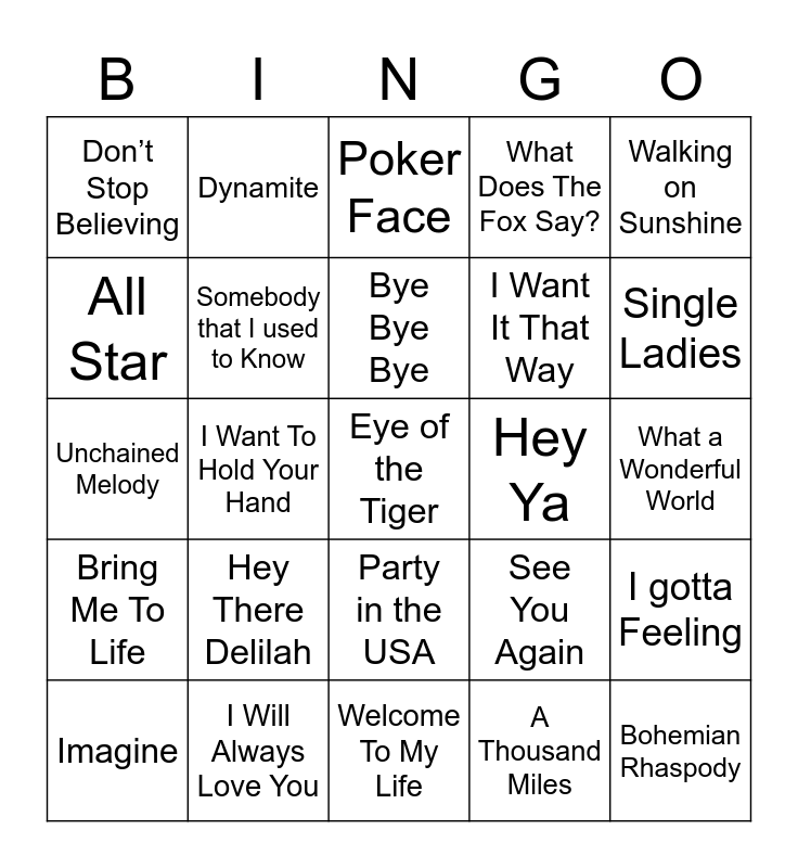This bingo card has 59 words: Thriller, I Will Always Love You, Wake me up when September Ends, Bring Me To Life, A Thousand Miles, Mr. Brightside, Somebody that I used to Know, Piano Man, I Want It That Way, Livin’ On A Prayer, What Does The Fox Say?, Gangnam Style, All Star, Never Gonna Give You Up, My Heart Will Go On, Don’t Stop Believing, Eye of the Tiger, Walking on Sunshine, Baby One More Time, Bye Bye Bye, Hey Ya, Poker Face, Imagine, I gotta Feeling, Whatever You Like, Hey Soul Sister, Ice Ice Baby, Total Eclipse of the Heart, Single Ladies, Baby, Billie Jean, Call Me Maybe, Ring of Fire, What Makes You Beautiful, Dynamite, A Thousand Years, Hey Jude, I Want To Hold Your Hand, Hound Dog, Unchained Melody, Jailhouse Rock, Hey There Delilah, What a Wonderful World, Blank Space, Jolene, Wrecking Ball, You Belong With me, Cool For The Summer, Party in the USA, Welcome To My Life, The Sound of Silence, Stairway to Heaven, Not Afraid, Roar, Payphone, See You Again, Hello, Bohemian Rhaspody and Where is the Love.