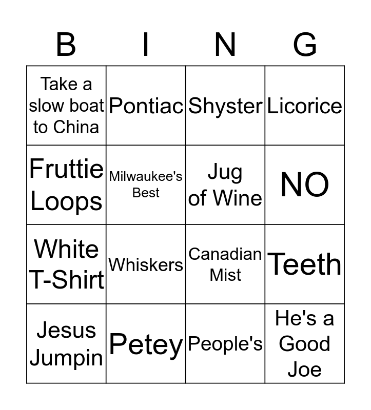 This bingo card has a free space and 15 words: Jesus Jumpin, He's a Good Joe, Shyster, Take a slow boat to China, NO, Fruttie Loops, Whiskers, People's, Milwaukee's Best, White T-Shirt, Teeth, Licorice, Jug of Wine, Pontiac and Petey.