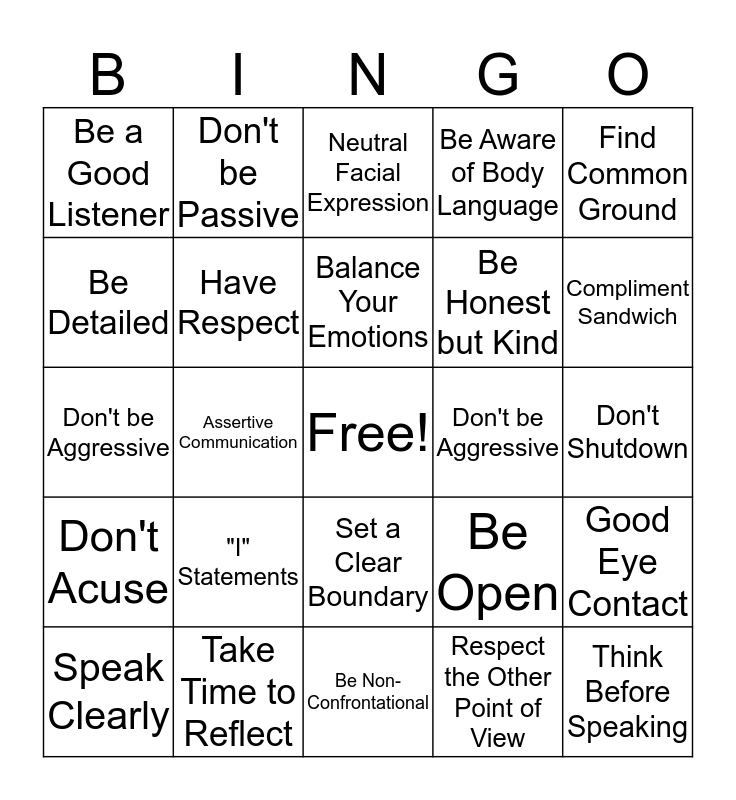 This bingo card has a free space and 24 words: "I" Statements, Take Time to Reflect, Balance Your Emotions, Speak Clearly, Find Common Ground, Be a Good Listener, Be Detailed, Don't be Passive, Don't be Aggressive, Set a Clear Boundary, Be Honest but Kind, Don't be Aggressive, Be Open, Good Eye Contact, Have Respect, Respect the Other Point of View, Don't Shutdown, Neutral Facial Expression, Compliment Sandwich, Assertive Communication, Think Before Speaking, Don't Acuse, Be Aware of Body Language and Be Non-Confrontational.