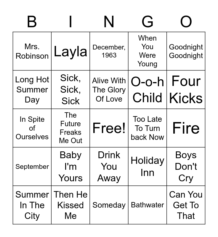 This bingo card has a free space and 42 words: 6th Avenue Heartache, Alive With The Glory Of Love, Anna Sun, Baby I'm Yours, Bathwater, Boys Don't Cry, Can You Get To That, C.R.E.A.M., December, 1963, Drink You Away, Fire, Four Kicks, The Future Freaks Me Out, Goodnight Goodnight, Here (In Your Arms), Holiday Inn, I Feel The Earth Move, In Spite of Ourselves, I Wanna Dance With Somebody, Layla, Long Hot Summer Day, Midnight Rider, Mona Lisas and Mad Hatters, Mrs. Robinson, Never Been To Spain, Nine In The Afternoon, O-o-h Child, Peaches, Pyro, Rocky Mountain Way, SAD!, September, Sick, Sick, Sick, Someday, Stolen Chance, Summer In The City, Then He Kissed Me, Too Late To Turn back Now, Try A Little Tenderness, Walking On a Dream, When You Were Young and You Make My Dreams.