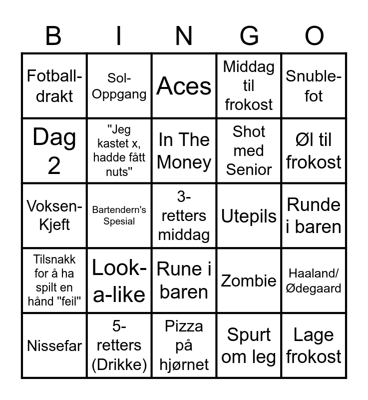 This bingo card has a free space and 24 words: Look-a-like, 5-retters (Drikke), In The Money, Nissefar, Snuble-fot, Fotball-drakt, Dag 2, Sol-Oppgang, Utepils, Rune i baren, Shot med Senior, Voksen-Kjeft, Zombie, Haaland/Ødegaard, ''Jeg kastet x, hadde fått nuts'', Spurt om leg, Runde i baren, Aces, Øl til frokost, Bartendern's Spesial, Lage frokost, Tilsnakk for å ha spilt en hånd ''feil'', Middag til frokost and Pizza på hjørnet.
