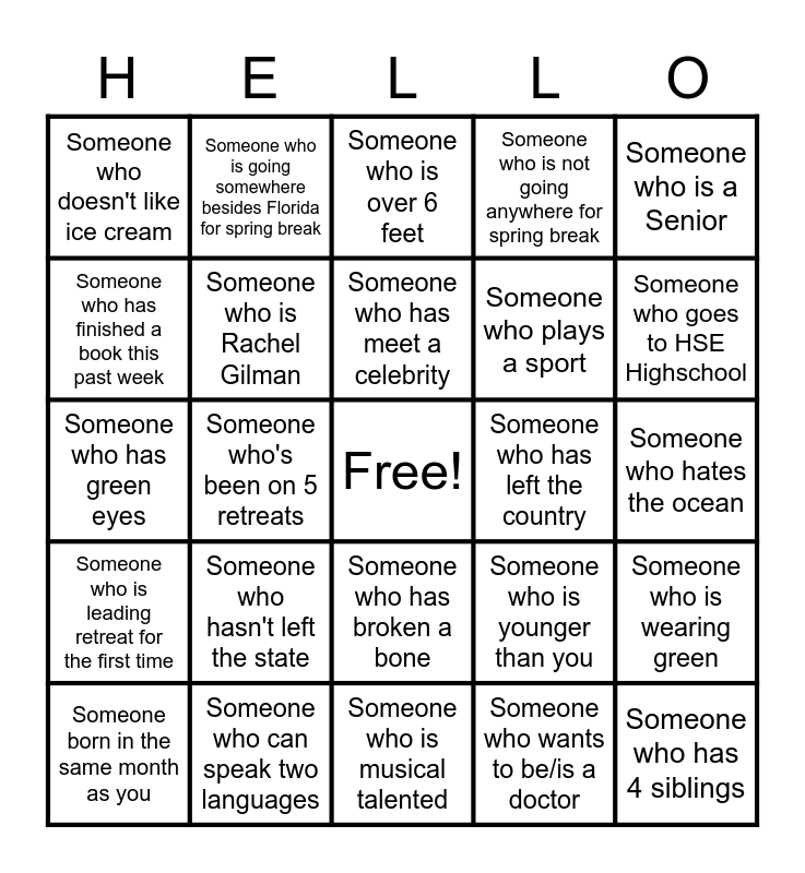 This bingo card has a free space and 29 words: Someone born in the same month as you, Someone with a cat and a dog, Someone who's been on 5 retreats, Someone who is older than you, Someone who doesn't like ice cream, Someone who is over 6 feet, Someone who is Rachel Gilman, Someone who hasn't left the state, Someone who has left the country, Someone who can speak two languages, Someone who hates the ocean, Someone who has 4 siblings, Someone who is musical talented, Someone who wants to be/is a doctor, Someone who goes to HSE Highschool, Someone who owns 9 or more pairs of shoes, Someone who has broken a bone, Someone who is leading retreat for the first time, Someone who is a Senior, Someone who has green eyes, Someone who is younger than you, Someone who is a vegetarian, Someone who plays a sport, Someone who has finished a book this past week, Someone who is not going anywhere for spring break, Someone who is going somewhere besides Florida for spring break, Someone who is wearing green, Someone who has meet a celebrity and Someone who's never had a pet.