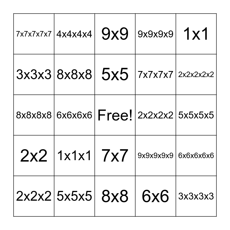 This bingo card has a free space and 29 words: 2x2x2, 3x3, 6x6x6x6, 4x4x4, 7x7x7x7x7, 9x9, 8x8x8, 1x1x1, 2x2x2x2, 5x5x5, 5x5x5x5, 3x3x3x3, 8x8, 6x6, 2x2x2x2x2, 4x4, 7x7, 2x2, 1x1, 8x8x8x8, 9x9x9x9x9, 7x7x7, 7x7x7x7, 3x3x3, 9x9x9x9, 4x4x4x4, 6x6x6x6x6, 5x5 and 5x5x5.