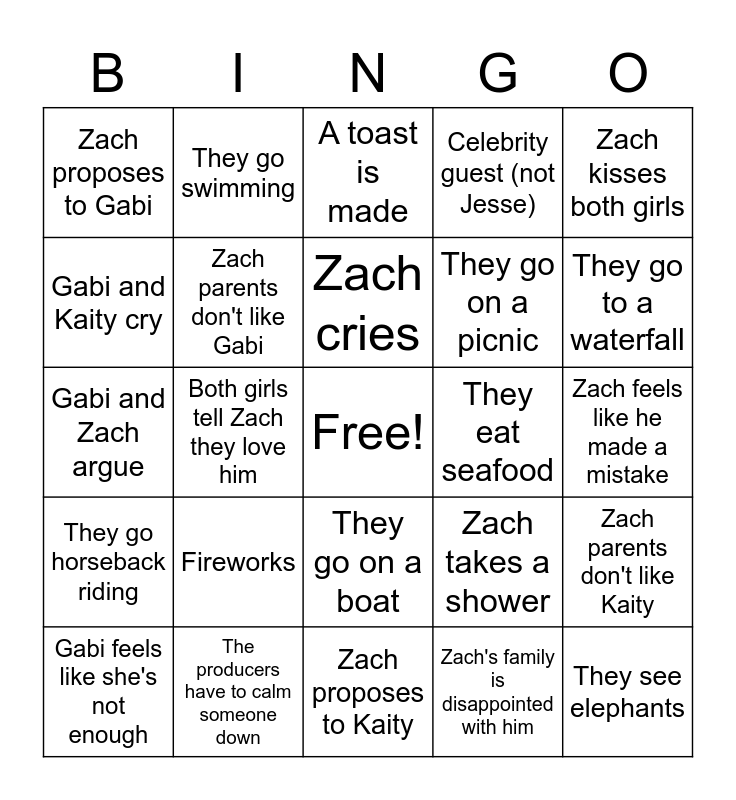 This bingo card has a free space and 24 words: Fireworks, The producers have to calm someone down, Zach cries, Gabi feels like she's not enough, Zach kisses both girls, Zach proposes to Gabi, Gabi and Kaity cry, They go swimming, They eat seafood, They go on a boat, They go on a picnic, Gabi and Zach argue, Zach takes a shower, Zach parents don't like Kaity, Zach parents don't like Gabi, Zach's family is disappointed with him, Zach feels like he made a mistake, A toast is made, They go to a waterfall, Both girls tell Zach they love him, They see elephants, They go horseback riding, Celebrity guest (not Jesse) and Zach proposes to Kaity.