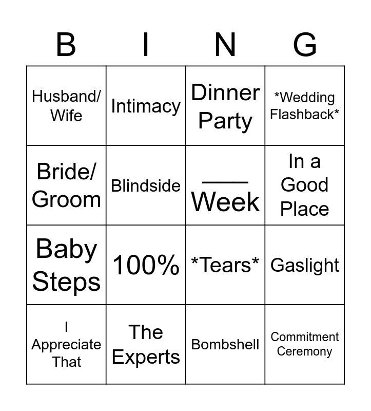 This bingo card has 18 words: 100%, Commitment Ceremony, Dinner Party, Husband/ Wife, *Tears*, *Wedding Flashback*, I Appreciate That, Intimacy, In a Good Place, Baby Steps, Bombshell, Bride/ Groom, Gaslight, Blindside, ___ Week, Connection, The Experts and The Couch.