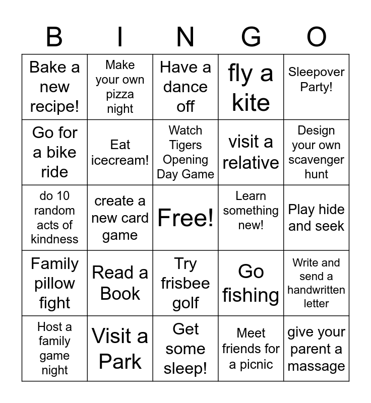 This bingo card has a free space and 24 words: Read a Book, Visit a Park, Watch Tigers Opening Day Game, Host a family game night, Sleepover Party!, Bake a new recipe!, Go for a bike ride, Make your own pizza night, Learn something new!, Try frisbee golf, visit a relative, do 10 random acts of kindness, Go fishing, Write and send a handwritten letter, Eat icecream!, Meet friends for a picnic, Play hide and seek, Have a dance off, Design your own scavenger hunt, create a new card game, give your parent a massage, Family pillow fight, fly a kite and Get some sleep!.