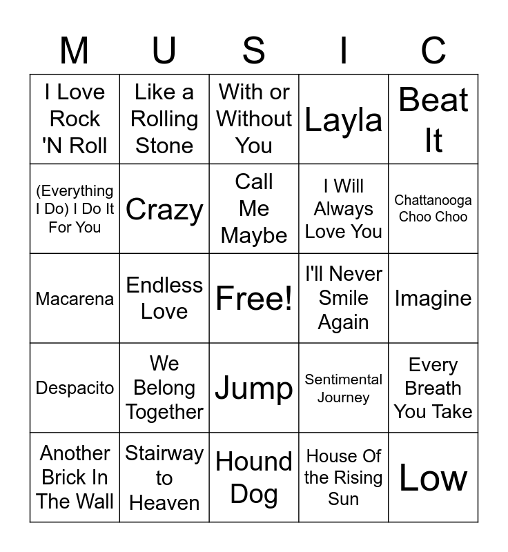This bingo card has a free space and 70 words: Bohemian Rhapsody, Imagine, Bridge Over Troubled Water, Hotel California, Stairway to Heaven, Let It Be, Layla, Billie Jean, Beat It, Happy, Every Breath You Take, When Doves Cry, I Love Rock 'N Roll, With or Without You, Livin' On A Prayer, Endless Love, Jump, I Will Always Love You, Smells Like Teen Spirit, Despacito, I'll Never Smile Again, Sentimental Journey, Chattanooga Choo Choo, Star Dust, I'll Never Smile Again, Rolling in the Deep, Shape of You, Uptown Funk, House Of the Rising Sun, (Sittin' On) the Dock of the Bay, Like a Rolling Stone, Yesterday, Good Vibrations, I Want To Hold Your Hand, Respect, (I Can't Get No) Satisfaction, I Heard It Through The Grapevine, We Found Love, Yeah, (Everything I Do) I Do It For You, Hello, We Belong Together, Low, Umbrella, Single Ladies (Put a Ring On it), Crazy, Another Brick In The Wall, Hey Jude, All I have To Do Is Dream, What'd I Say, Tennessee Waltz, Johnny B Goode, Jailhouse Rock, Don't Be Cruel, Hound Dog, Heartbreak Hotel, Call Me Maybe, Crazy in Love, I Gotta Feeling, Hey Ya!, Macarena, Wonderwall, Losing My Religion, My Heart Will Go On, Nothing Compares 2 U, Mack The Knife, (We're Gonna) Rock Around The Clock, As Time Goes By, Take The "A" Train and When You Wish Upon a Star.