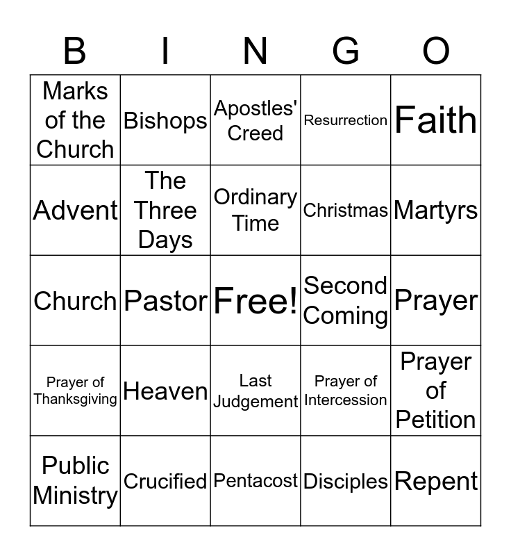 This bingo card has a free space and 44 words: Incarnation, Repent, Prophet, Public Ministry, Apostle, Disciples, Apostles' Creed, Kingdom of God, Faith, Crucified, Resurrection, Second Coming, Last Judgement, Heaven, Ascension, Pentacost, Christians, Church, Gospel, Martyrs, Bishops, Pope, Dioceses, Marks of the Church, Justice, Prayer, liturgy, Prayer of Blessing, Prayer of Intercession, Prayer of Thanksgiving, Prayer of Praise, Prayer of Petition, Pilgrimages, Parish, Pastor, Deacon, Ministries, Lord's Prayer, Ordinary Time, Advent, Christmas, Lent, The Three Days and Easter.