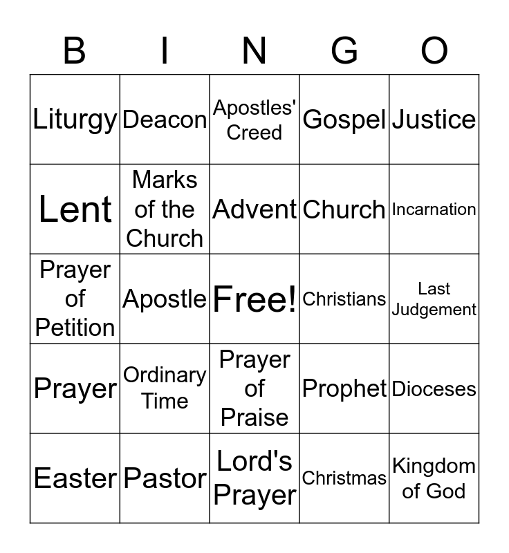 This bingo card has a free space and 44 words: Resurrection, Kingdom of God, Prayer of Intercession, Easter, Pentacost, Christmas, Apostles' Creed, Prayer of Blessing, Justice, Pastor, Gospel, Christians, Prayer of Praise, Ordinary Time, Public Ministry, Lord's Prayer, Bishops, Prayer of Petition, Repent, Incarnation, Deacon, Crucified, Martyrs, Liturgy, Ascension, Last Judgement, Ministries, Parish, Prophet, Prayer, Disciples, Dioceses, the Three Days, Pope, Apostle, Prayer of Thanksgiving, Second Coming, Heaven, Advent, Lent, Church, Pilgrimages, Marks of the Church and Faith.