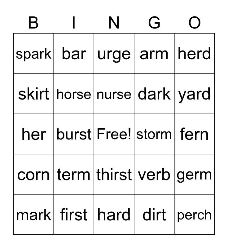 This bingo card has a free space and 71 words: car, bar, far, part, hard, start, arm, jar, dark, farm, mark, star, yard, spark, yarn, her, verb, herd, perm, fern, term, perch, germ, clerk, stern, per, serve, nerve, bird, girl, first, third, sir, shirt, dirt, birth, firm, stir, skirt, whirl, thirst, twirl, corn, for, or, born, north, horse, torn, short, shorty, sort, storm, force, horn, form, nurse, turn, fur, hurt, church, purse, burst, burn, curve, curb, urge, curl, surf, blur and burnt.