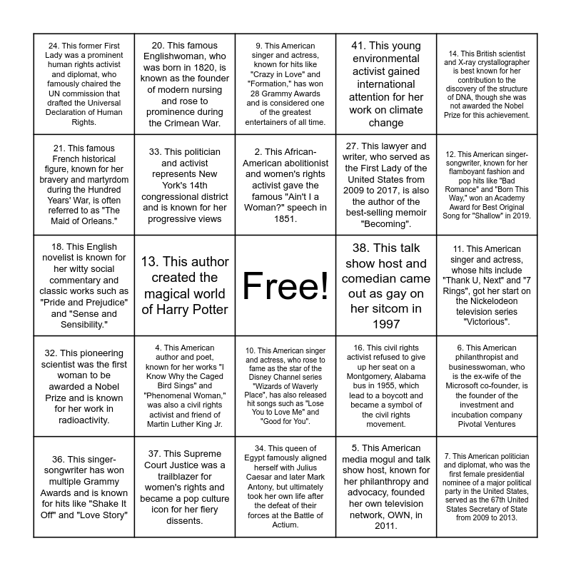 This bingo card has a free space and 42 words: 1. This actress portrayed Hermione Granger in the Harry Potter film series, 2. This African-American abolitionist and women's rights activist gave the famous "Ain't I a Woman?" speech in 1851., 3. This American author and Nobel laureate wrote novels such as "Beloved" and "Song of Solomon" that explore the African American experience., 4. This American author and poet, known for her works "I Know Why the Caged Bird Sings" and "Phenomenal Woman," was also a civil rights activist and friend of Martin Luther King Jr., 5. This American media mogul and talk show host, known for her philanthropy and advocacy, founded her own television network, OWN, in 2011., 6. This American philanthropist and businesswoman, who is the ex-wife of the Microsoft co-founder, is the founder of the investment and incubation company Pivotal Ventures, 7. This American politician and diplomat, who was the first female presidential nominee of a major political party in the United States, served as the 67th United States Secretary of State from 2009 to 2013., 8. This American politician, who has represented California's 12th congressional district in the House of Representatives since 1987, became the first female Speaker of the United States House of Representatives in 2007., 9. This American singer and actress, known for hits like "Crazy in Love" and "Formation," has won 28 Grammy Awards and is considered one of the greatest entertainers of all time., 10. This American singer and actress, who rose to fame as the star of the Disney Channel series "Wizards of Waverly Place", has also released hit songs such as "Lose You to Love Me" and "Good for You"., 11. This American singer and actress, whose hits include "Thank U, Next" and "7 Rings", got her start on the Nickelodeon television series "Victorious"., 12. This American singer-songwriter, known for her flamboyant fashion and pop hits like "Bad Romance" and "Born This Way," won an Academy Award for Best Original Song for "Shallow" in 2019., 13. This author created the magical world of Harry Potter, 14. This British scientist and X-ray crystallographer is best known for her contribution to the discovery of the structure of DNA, though she was not awarded the Nobel Prize for this achievement., 15. This Catholic nun, who devoted her life to helping the poor and sick in India, where she founded the Missionaries of Charity, was awarded the Nobel Peace Prize in 1979., 16. This civil rights activist refused to give up her seat on a Montgomery, Alabama bus in 1955, which lead to a boycott and became a symbol of the civil rights movement., 17. This current reigning monarch of the United Kingdom has held the title since 1952 and is the longest-reigning monarch in British history., 18. This English novelist is known for her witty social commentary and classic works such as "Pride and Prejudice" and "Sense and Sensibility.", 19. This famous American activist and author, who was born both deaf and blind, overcame immense obstacles to become a renowned advocate for disability rights., 20. This famous Englishwoman, who was born in 1820, is known as the founder of modern nursing and rose to prominence during the Crimean War., 21. This famous French historical figure, known for her bravery and martyrdom during the Hundred Years' War, is often referred to as "The Maid of Orleans.", 22. This famous queen, known for her extravagant lifestyle and the quote "Let them eat cake," was executed during the French Revolution., 23. This female politician served as the first female Prime Minister of India for a total of 15 years, and was assassinated in 1984., 24. This former First Lady was a prominent human rights activist and diplomat, who famously chaired the UN commission that drafted the Universal Declaration of Human Rights., 25. This former Senator from California made history in 2021 as the first woman, first Black person, and first person of South Asian descent to become Vice President of the United States., 26. This Grammy-winning British singer-songwriter is known for hits such as "Hello," "Someone Like You," and "Rolling in the Deep.", 27. This lawyer and writer, who served as the First Lady of the United States from 2009 to 2017, is also the author of the best-selling memoir "Becoming"., 28. This Mexican artist, known for her self-portraits, is considered one of the most important painters of the 20th century., 29. This Pakistani activist, who survived an assassination attempt by the Taliban in 2012, became the youngest Nobel Prize laureate in history in 2014., 30. This person is the current director of the women's center and works as a social justice educator and advocate., 31. This person is the founding director of AsACC at UConn and continues to advocate for the Asian American and female community., 32. This pioneering scientist was the first woman to be awarded a Nobel Prize and is known for her work in radioactivity., 33. This politician and activist represents New York's 14th congressional district and is known for her progressive views, 34. This queen of Egypt famously aligned herself with Julius Caesar and later Mark Antony, but ultimately took her own life after the defeat of their forces at the Battle of Actium., 35. This renowned British primatologist and anthropologist has spent decades studying chimpanzees in Tanzania and is a prominent advocate for animal welfare and conservation efforts., 36. This singer-songwriter has won multiple Grammy Awards and is known for hits like "Shake It Off" and "Love Story", 37. This Supreme Court Justice was a trailblazer for women's rights and became a pop culture icon for her fiery dissents., 38. This talk show host and comedian came out as gay on her sitcom in 1997, 39. This tennis player has won 23 Grand Slam singles titles and 4 Olympic gold medals, 40. This Underground Railroad conductor and Union spy was also known as "Moses" and helped lead over 300 enslaved people to freedom., 41. This