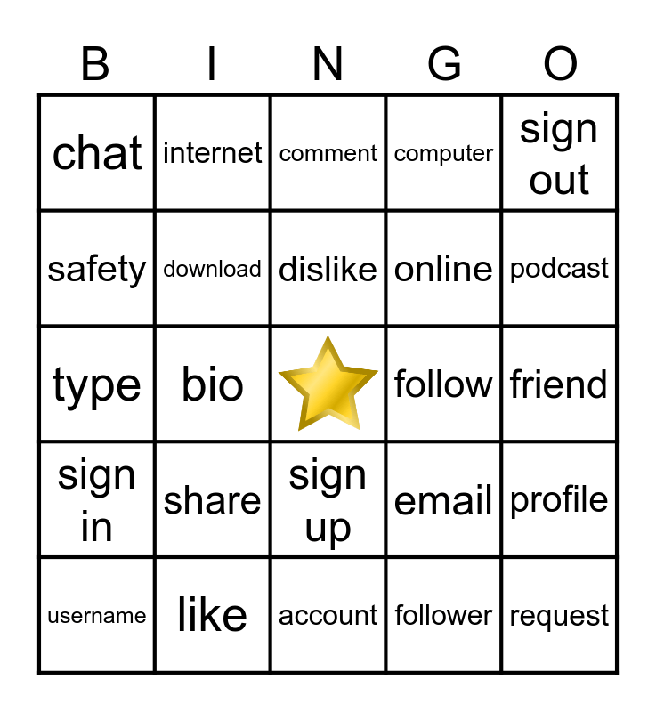 This bingo card has a free space and 31 words: account, agree, bio, blog, chat, comment, download, email, follow, follower, friend, request, message, password, podcast, post, profile, share, sign in, sign up, sign out, upload, username, internet, online, safety, computer, type, like, dislike and search.